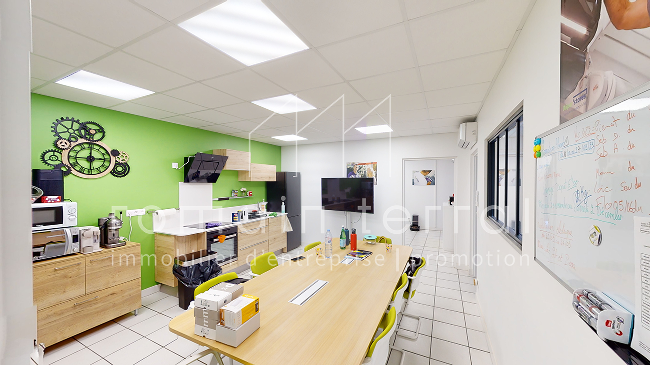 Sa superficie d’environ 153m2 comprend un accueil, un bureau individuel, une salle de réunion avec cuisine, des sanitaires équipés d’une douche, un vestiaire ainsi qu’un atelier d’environ 104m2 équipé d’une mezzanine.